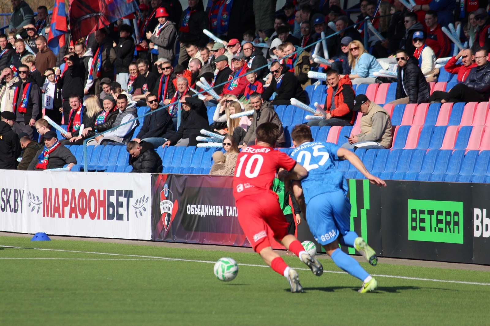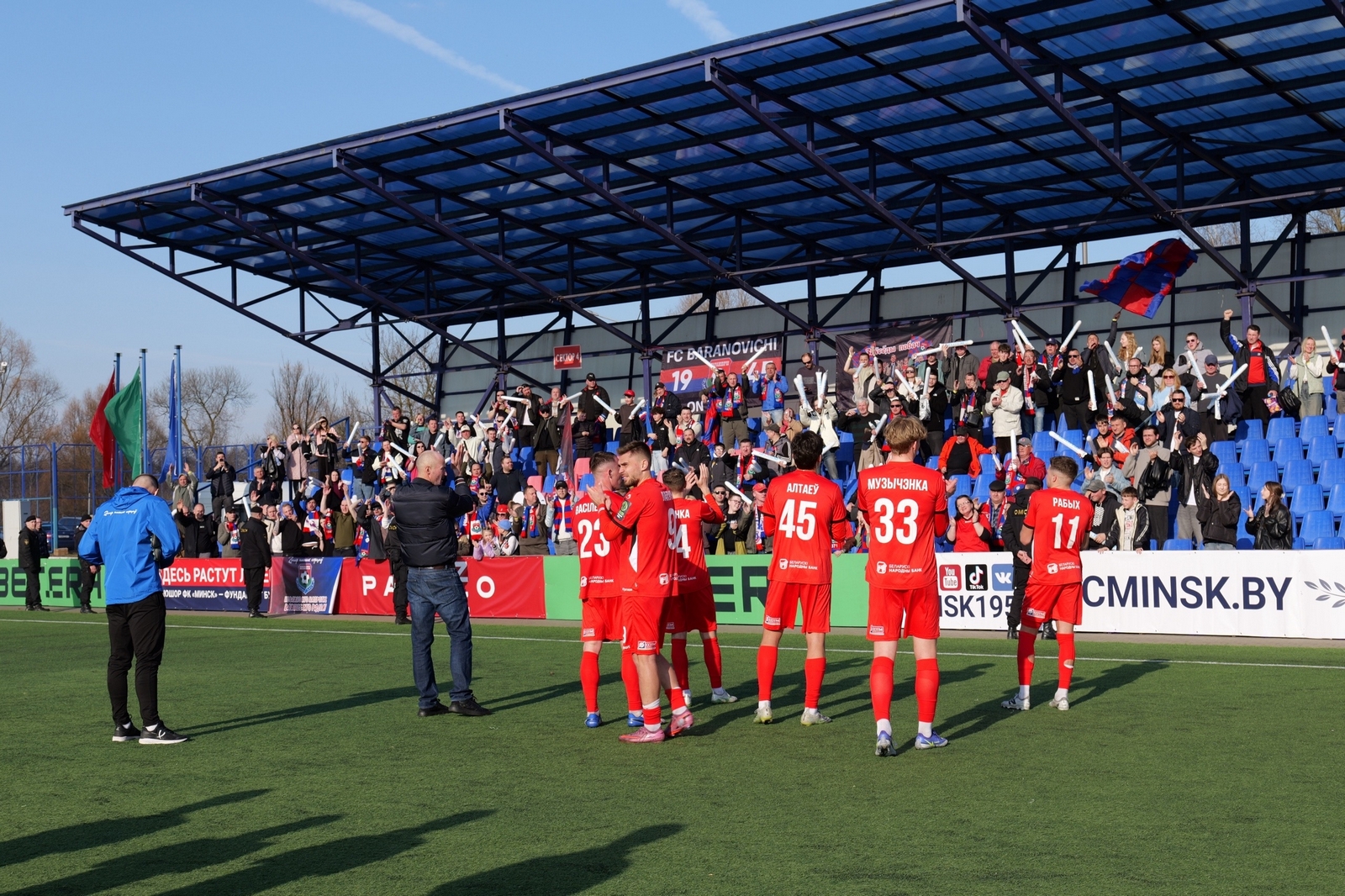 Иван меня встретил, мы пообщались, он подарил мне клубный шарфик. Мы подошли к полю и посмотрели на разминку команды. И потом я пошел смотреть игру на фан-сектор «Барановичей» вместе со своим водителем.