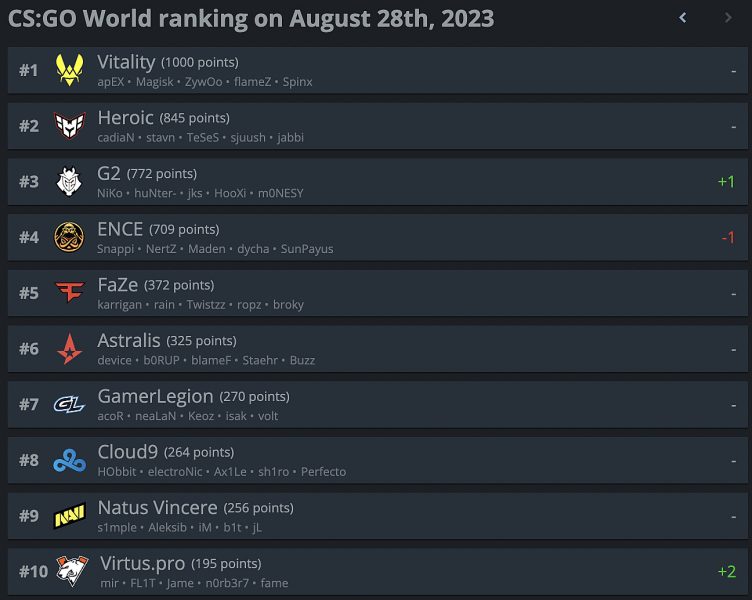 Портал hltv представил обновленный рейтинг лучших коллективов мира. Vitality продолжает возглавлять рейтинг, как и Heroic остается второй. G2 Esports поменялась позициями с ENCE. С пятого по девятое место позиции не изменились. Также в топ-10 вошла Virtus.pro.