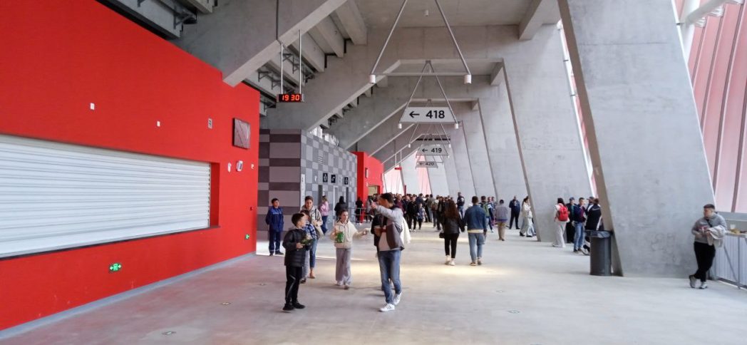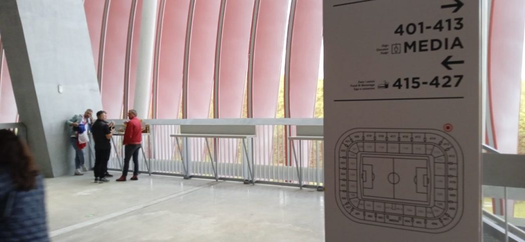 По сравнению со своей соседкой на «старичке», расположенной под одной трибуной, эта анфилада выглядит внушительно, с несколькими спусками по периметру и широкими выходами на нее с трибунных углов арены. Кстати, все это позволяет зрителям после матча оперативно и без толчеи покинуть арену.