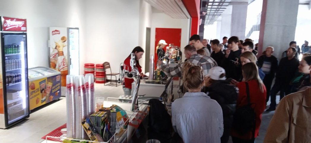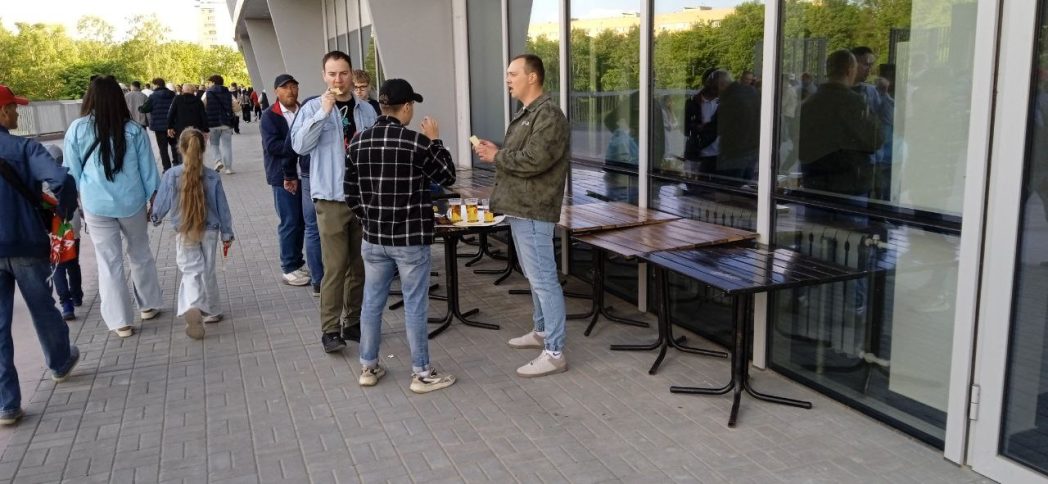 Неподалеку множество россиян потягивали пиво, стоявшее на парапете террасы. Столиков на стадионе явно не хватает. И это при не до конца заполненных трибунах (по протоколу — 27 314 зрителей).