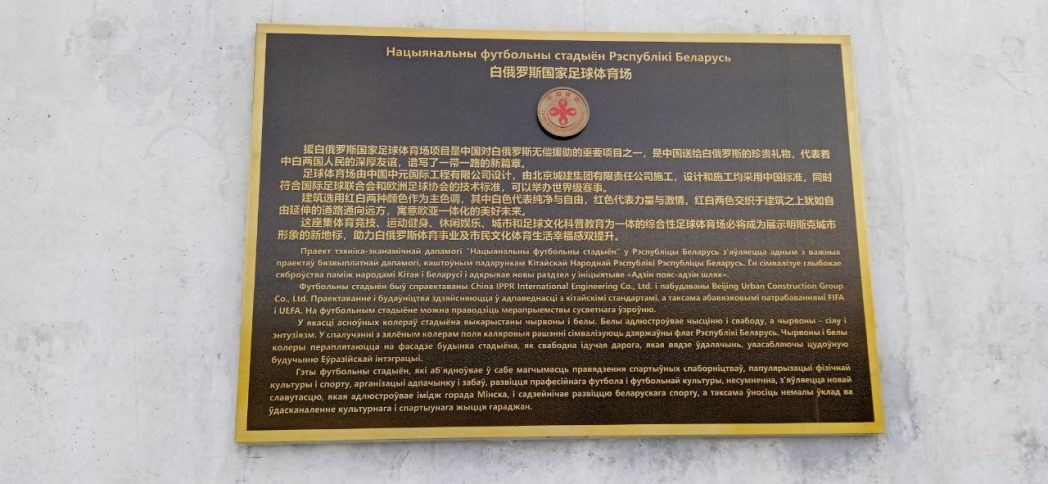 Но куда понятнее то, что возведение арены профинансировано властями КНР, несведущему становится при лицезрении оригинальной скульптуры — два «золотых» футболиста с мячом в «серебряном» кольце на «бронзовом» земном шаре, на котором выделены КНР и Беларусь, соединенные «золотой» лентой.