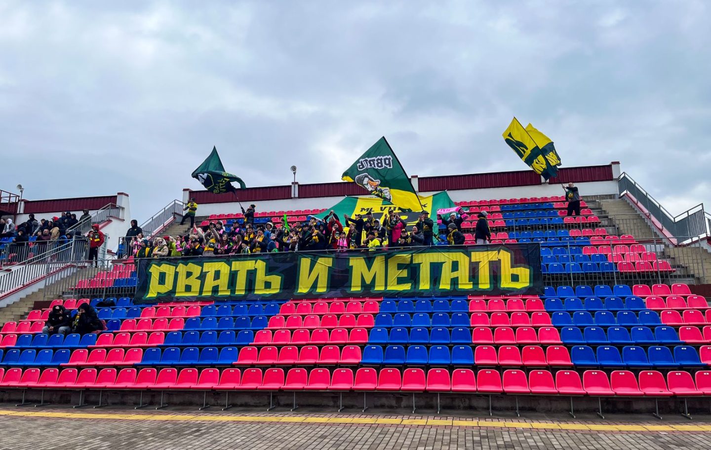 Тем временем на гостевом секторе был вывешен свой баннер — с привычной надписью «Рвать и метать».