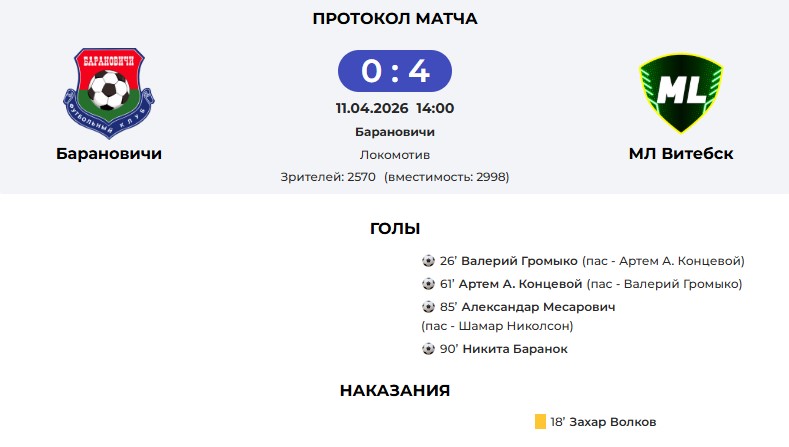 Тем временем в ворота «Барановичей» влетел и четвертый мяч, и матч плавно начал подходить к концу. В итоге стадион «Локомотив» оказался заполнен на 85 процентов — 2 570 зрителей при вместимости 2 998.