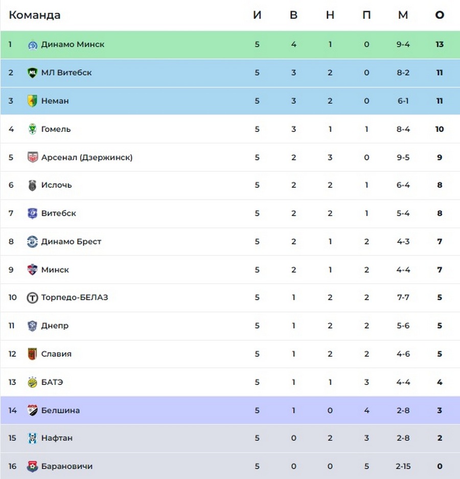 Команда Александра Шагойко набрала 13 очков в 5 турах, что является лучшим результатом. Шедшие с нею вровень после 4 туров «МЛ Витебск» и «Неман» сыграли вничью 0:0 с брестским «Динамо» и «Славией» соответственно, поэтому отстают от минского «Динамо» на 2 балла.