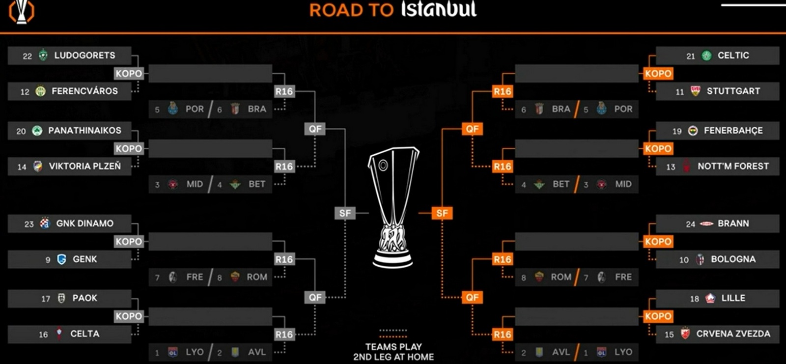 Победители стыков по сумме двух игр выйдут в 1/8 финала, где присоединятся к «Лиону», «Астон Вилле», «Мидтьюлланду», «Бетису», «Порту», «Браге», «Фрайбургу» и «Роме».