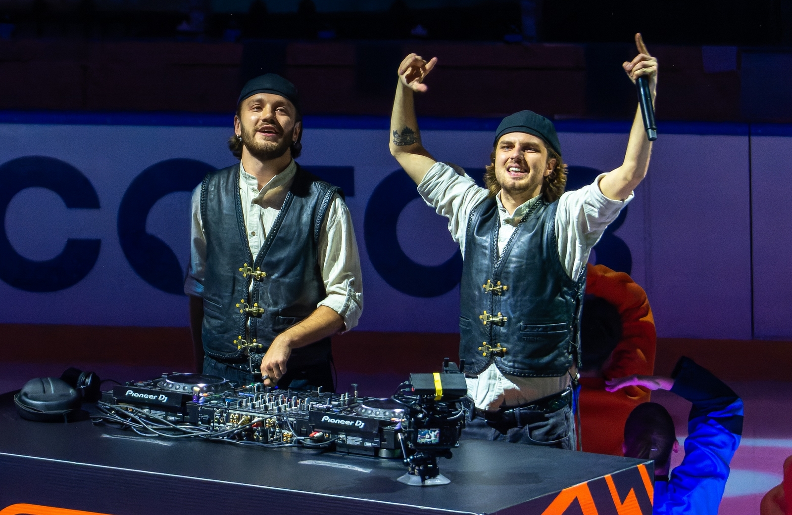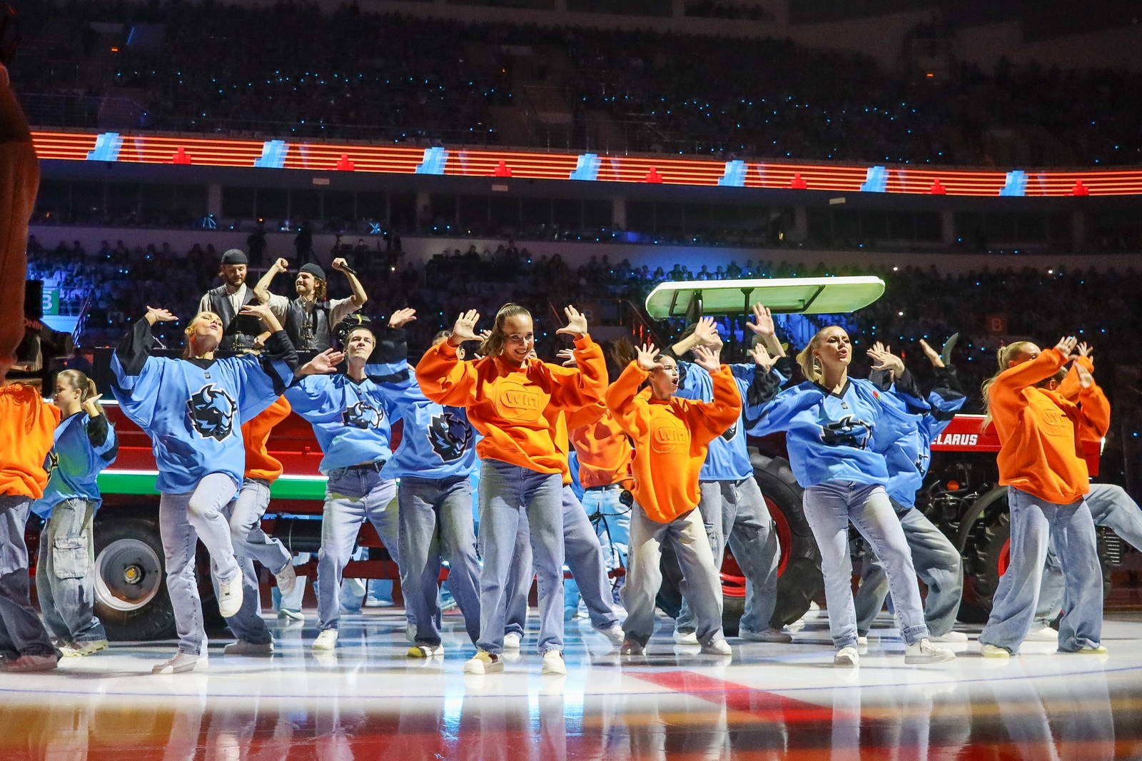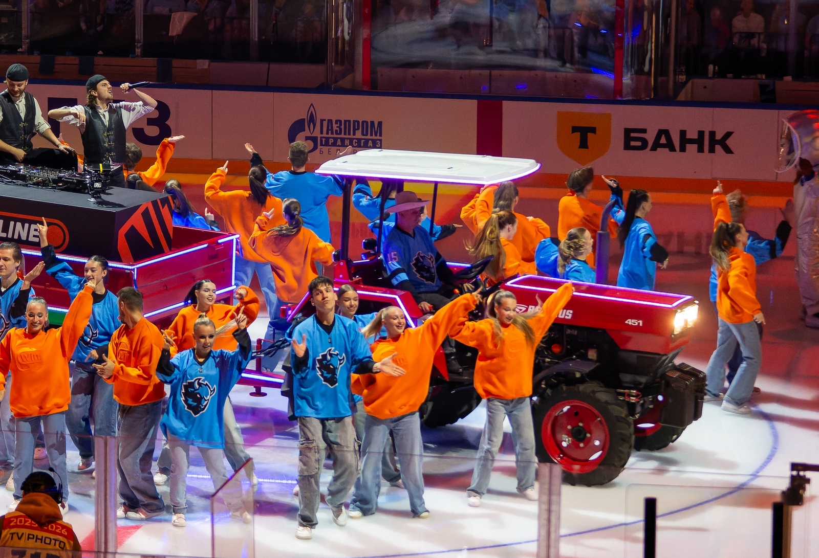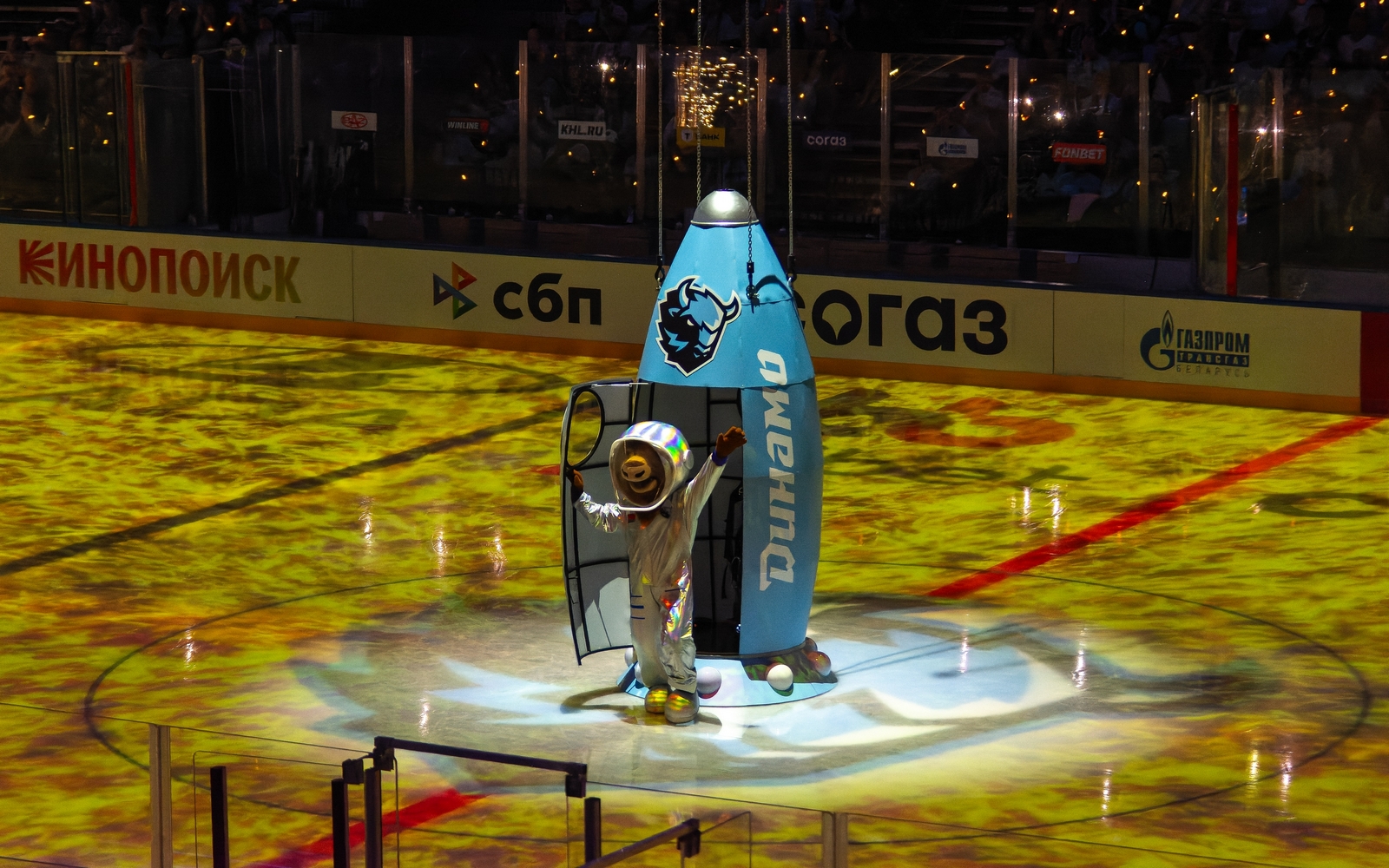 После речей из недр видеокуба на лед опустилась ракета с собственно Зубриком на борту. Динамовский маскот выбрался наружу в скафандре и «передал эстафету» трактору с двумя диджеями в прицепе, который выкатил в центральный круг и образовал вокруг себя столпотворение. Дальше были танцы вокруг этого трактора и на расположенных поодаль поднимающихся платформах, плавно перетекшие в представление стартовых составов.