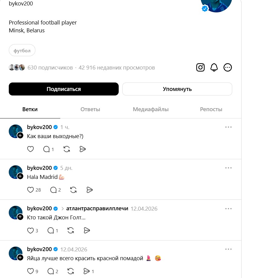 Что говорят? А говорят, что упросить Артема Быкова хотя бы на краткий комментарий даже после удачного матча — задача не просто со звездочкой, а почти неразрешимая. Полузащитник и в пору выступлений за минское и брестское «Динамо» предпочитал избегать бесед с журналистами, не изменяет себе и сейчас. Зато с недавних пор ведет аккаунт в Threads.